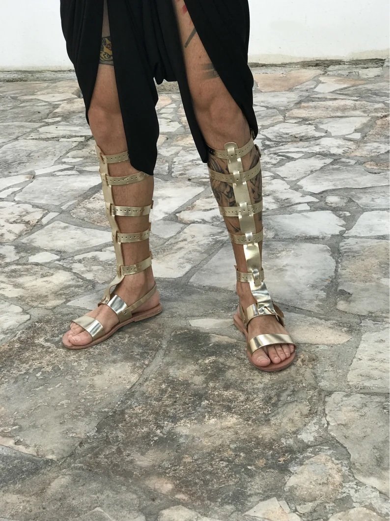 Tall knee length gladiator sandals for men in gold leather.
