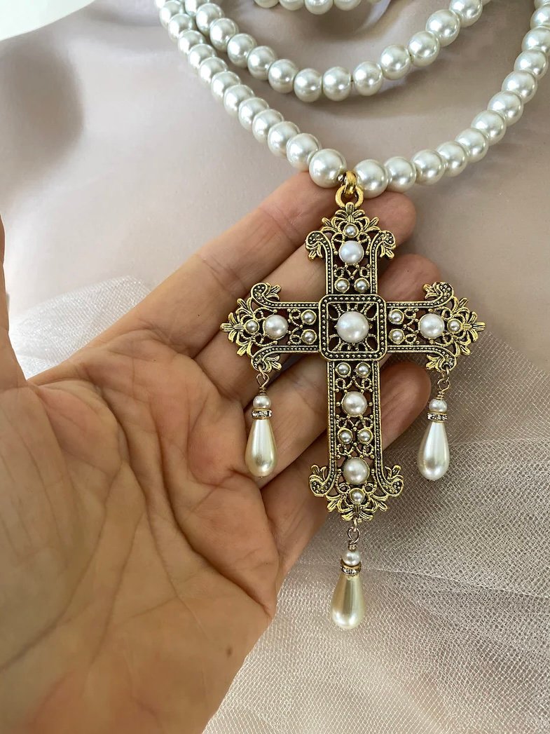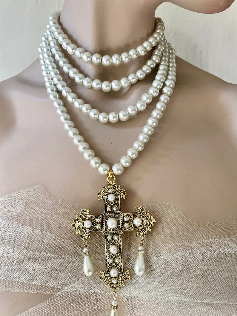 This stunning necklace showcases a gothic renaissance cross, which adds an edgy yet elegant touch. Each pearl is carefully selected, ensuring high quality that shines beautifully. Whether you wear it casually or for an upscale event, this necklace stands out.